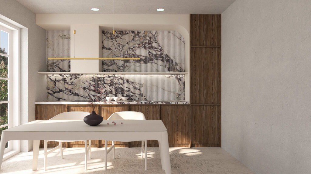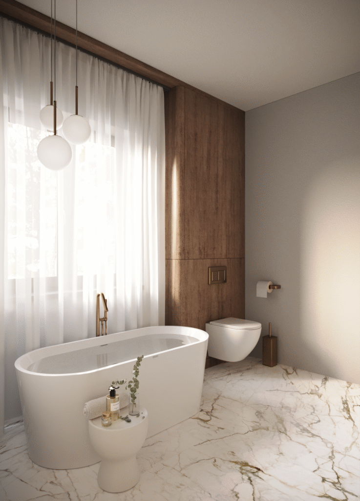 Ten elegancki apartament w Warszawie na Mokotowie to połączenie stylu i komfortu. Jasna przestrzeń salonu z otwartą kuchnią zachwyca lekkością, a nowoczesne wnętrze podkreślają naturalne materiały, złote akcenty i designerskie detale. Duże przeszklenia wprowadzają światło, które wydobywa harmonię kolorów i faktur – od drewna po marmur i beton. To stylowe mieszkanie, które łączy estetykę i funkcjonalność w spójną całość.