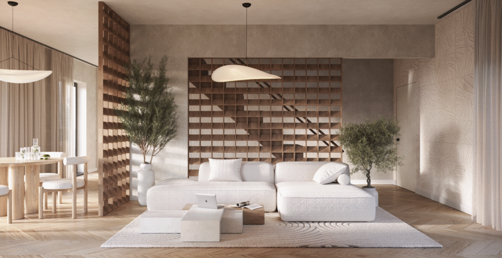 proste formy oraz wyważona kolorystyka tworzą przestrzeń sprzyjającą relaksowi. Sypialnie w odcieniach beżu i szarości zapewniają codzienny komfort i poczucie spokoju. Ta aranżacja wnętrz to przykład, jak stworzyć mieszkanie, które odpowiada na potrzeby życia w mieście, a jednocześnie daje przestrzeń do odpoczynku i wyciszenia.